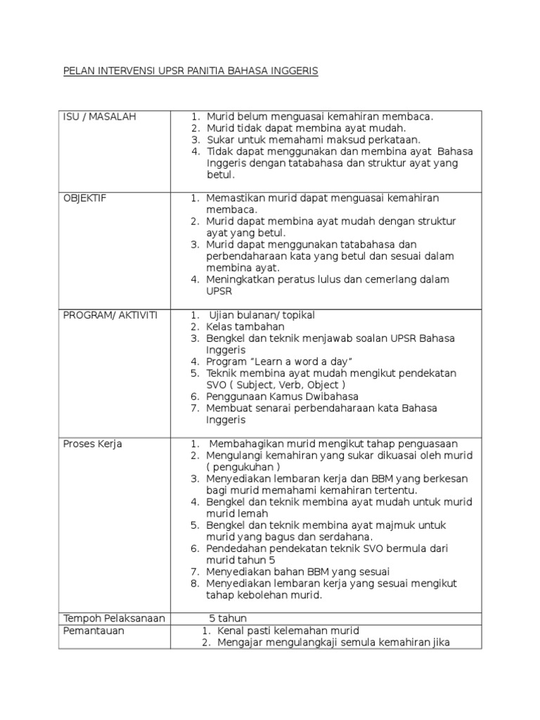 Pelan Intervensi Upsr Panitia Bahasa Inggeris Ver97 Pdf